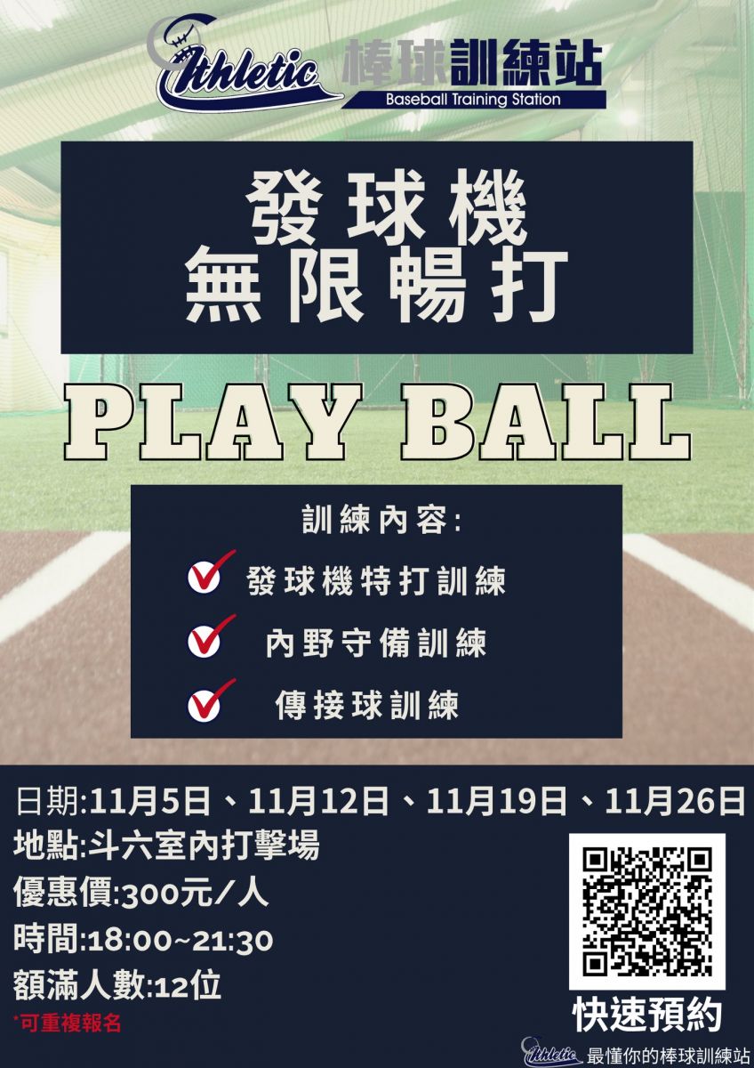 十一月份特打開放報名~-『室內發球機特打活動』-特打開放日期 :11月5日、11月12日、11月19日、11月26日。三個半小時的發球機無限暢打,又有專業的教練在B球道進行Logu守備練習~手刀報名。-活動內容:室內發球機無限暢打時間-18:00-21:30,3.5小時發球機不限時間特打。地點:(室內打擊場)費用:300元/人額滿人數:14人 (*為了維護品質每場次名額限14位)。-*報名室內發球機特打請留:特打日期、姓名及電話。-注意事項*1.需自備個人用具&球棒2.僅提供公用頭盔--最後提醒大家,課程記得提前預約,以免人數額滿喔~還沒加入我們LINE的好友們快拿起手機加入ID:https://lin.ee/pjQahu5@198pobgk(要加小老鼠@哦)#1對1棒球私人教練#投球訓練#棒球訓練#打擊訓練#專屬個人課程設計#運動家_棒球訓練站#運動家育樂有限公司