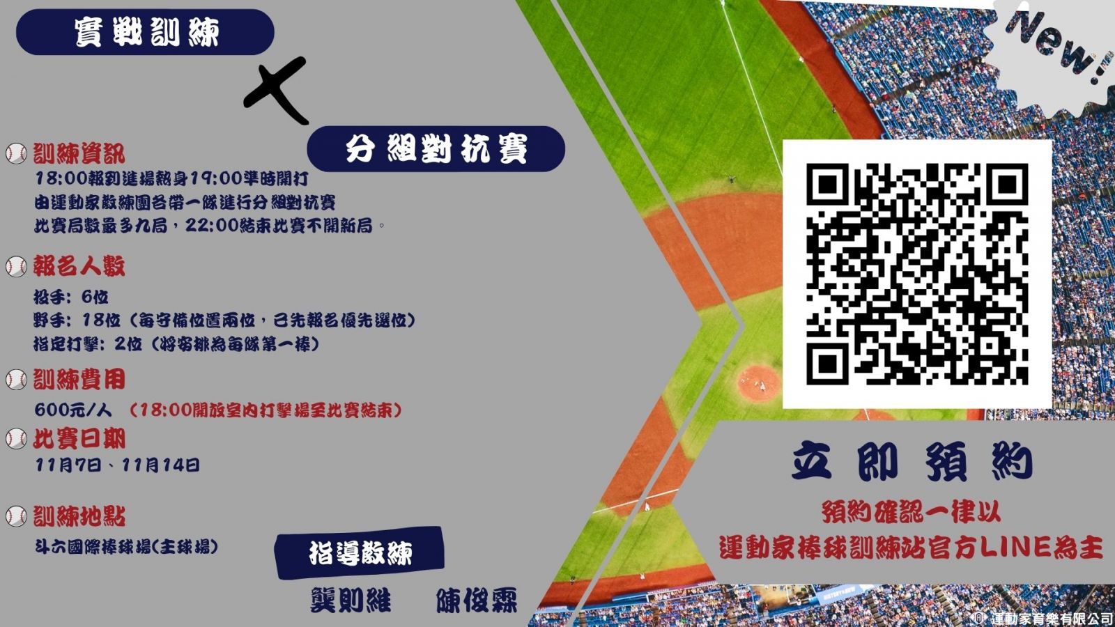 十一月夜間分組對抗賽開放報名-*18:00-18:30僅開放室內打擊場熱身使用,於18:30開放主球場夜間照明設備,(請盡量於18:30前報到熱身,常因天候影響會提前十分鐘開打)。*親友可入場看球但不得進入場內、室內傳接球及打擊,需加收300元/人之費用。2人輪流打擊、守備均加收600元/人之費用。*比賽中請勿自行更換守備位置,更換守備位置需經過教練評估同意後才進行更換。*報名分組對抗請直接留:1.姓名2.電話3.守備位置4.預約日期。-進場時間為18:00開放進場熱身,比賽時間19:00開打,同時開放室內打擊場提供熱身及打擊訓練。-分組日期:分組日期:11月7日、11月14日。分組時間:夜間18:00~22:00。分組地點:斗六棒球場(主球場)費用:600元/人報名截止日:各守備位置額滿為止。-分組內容:由教練團進行分組,兩名教練個別帶領一隊進行分組對抗賽。比賽局數最多為九局,22:00後不開新局。-即日起開放各守備位置報名預約投手:6位(依照每位選手狀況安排,為保護投手將設定半局至多15分鐘)野手:18位(每個守備位置兩位,以報名順序優先選位)指定打擊:2位 *報名指定打擊將安排為第一棒報名請直接留:1.姓名2.電話3.守備位置4.預約日期。-注意事項1.需著球帽、球褲(顏色不拘)2.自備個人球具3.嚴禁草皮上揮棒、甩棒4.親友不得進入場內、室內傳接球打擊。5.此費用為1人費用,2人輪流打擊守備均加收600元/人之費用。*比賽中請勿自行更換守備位置,更換守備位置需經過教練評估同意後才進行更換。-最後提醒大家,課程記得提前預約,以免人數額滿喔~還沒加入我們LINE的好友們快拿起手機加入ID:https://lin.ee/pjQahu5@198pobgk(要加小老鼠@哦)#1對1棒球私人教練#投球訓練#棒球訓練#打擊訓練#專屬個人課程設計#運動家_棒球訓練站#運動家育樂有限公司