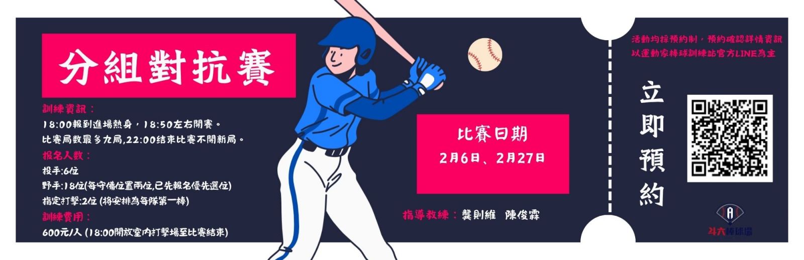 2026年2月夜間分組對抗賽開放報名囉-*18:00-18:30僅開放室內打擊場熱身使用,於18:30開放主球場夜間照明設備,(請盡量於18:30前報到熱身,常因天候影響會提前十分鐘開打)。*親友可入場看球但不得進入場內、室內傳接球及打擊,需加收300元/人之費用。2人輪流打擊、守備均加收600元/人之費用。*比賽中請勿自行更換守備位置,更換守備位置需經過教練評估同意後才進行更換。*報名分組對抗請直接留:1.姓名2.電話3.守備位置4.預約日期。-進場時間為18:00開放進場熱身,比賽時間19:00開打,同時開放室內打擊場提供熱身及打擊訓練。-分組日期:分組日期:2月6日、2月27日。分組時間:夜間18:00~22:00。分組地點:斗六棒球場(主球場)費用:600元/人報名截止日:各守備位置額滿為止。-分組內容:由教練團進行分組,兩名教練個別帶領一隊進行分組對抗賽。比賽局數最多為九局,22:00後不開新局。-即日起開放各守備位置報名預約投手:6位(依照每位選手狀況安排,為保護投手將設定半局至多15分鐘)野手:18位(每個守備位置兩位,以報名順序優先選位)指定打擊:2位 *報名指定打擊將安排為第一棒報名請直接留:1.姓名2.電話3.守備位置4.預約日期。-注意事項1.需著球帽、球褲(顏色不拘)2.自備個人球具3.嚴禁草皮上揮棒、甩棒4.親友不得進入場內、室內傳接球打擊。5.此費用為1人費用,2人輪流打擊守備均加收600元/人之費用。*比賽中請勿自行更換守備位置,更換守備位置需經過教練評估同意後才進行更換。-最後提醒大家,課程記得提前預約,以免人數額滿喔~還沒加入我們LINE的好友們快拿起手機加入ID:https://lin.ee/pjQahu5@198pobgk(要加小老鼠@哦)#1對1棒球私人教練#投球訓練#棒球訓練#打擊訓練#專屬個人課程設計#運動家_棒球訓練站#運動家育樂有限公司