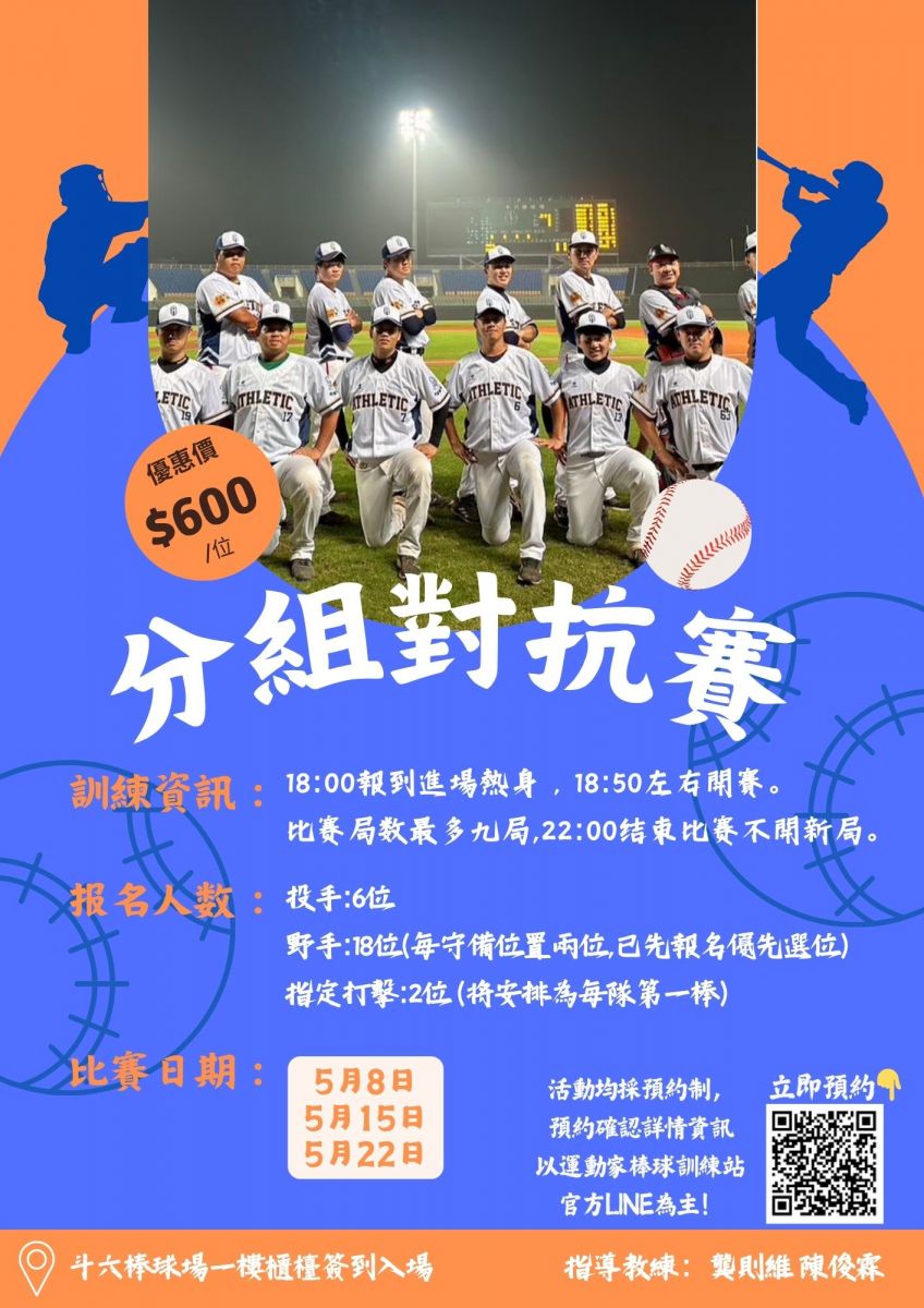 2026年5月夜間分組對抗賽久違了!要搶要快!-*18:00-18:30僅開放室內打擊場熱身使用,於18:30開放主球場夜間照明設備,(請盡量於18:30前報到熱身,常因天候影響會提前十分鐘開打)。*親友可入場看球但不得進入場內、室內傳接球及打擊,需加收300元/人之費用。2人輪流打擊、守備均加收600元/人之費用。*比賽中請勿自行更換守備位置,更換守備位置需經過教練評估同意後才進行更換。*報名分組對抗請直接留:1.姓名2.電話3.守備位置4.預約日期。-進場時間為18:00開放進場熱身,比賽時間19:00開打,同時開放室內打擊場提供熱身及打擊訓練。-分組日期:5月8日、5月15日、5月22日。分組時間:夜間18:00~22:00。分組地點:斗六棒球場(主球場) 費用:600元/人報名截止日:各守備位置額滿為止。-分組內容:由教練團進行分組,比賽局數最多為九局,22:00後不開新局。-即日起開放各守備位置報名預約投手:6位(依照每位選手狀況安排,為保護投手將設定半局至多15分鐘)野手:18位(每個守備位置兩位,以報名順序優先選位)指定打擊:2位 *報名指定打擊將安排為第一棒報名請直接留:1.姓名2.電話3.守備位置4.預約日期。-注意事項1.需著球帽、球褲(顏色不拘)2.自備個人球具3.嚴禁草皮上揮棒、甩棒4.親友不得進入場內、室內傳接球打擊。5.此費用為1人費用,2人輪流打擊守備均加收600元/人之費用。*比賽中請勿自行更換守備位置,更換守備位置需經過教練評估同意後才進行更換。-最後提醒大家,課程記得提前預約,以免人數額滿喔~還沒加入我們LINE的好友們快拿起手機加入ID:https://lin.ee/pjQahu5@198pobgk(要加小老鼠@哦)#1對1棒球私人教練#投球訓練#棒球訓練#打擊訓練#專屬個人課程設計#運動家_棒球訓練站#運動家育樂有限公司
